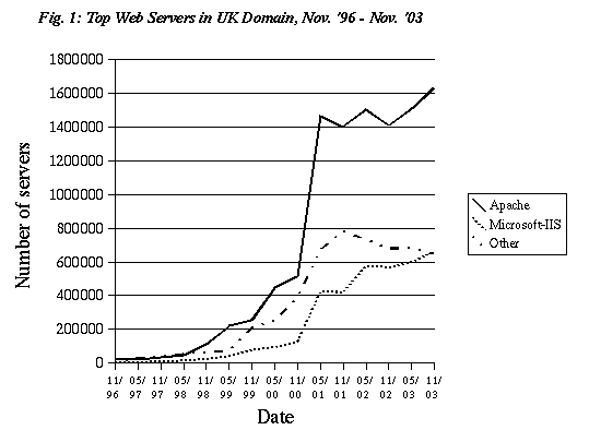 One of the most striking examples of growing OSS use has been the web server, Apache. Apache’s domination of the global market is widely cited, and an analysis of more local trends shows that it has also become a market-leader in the UK (see Fig. 15).